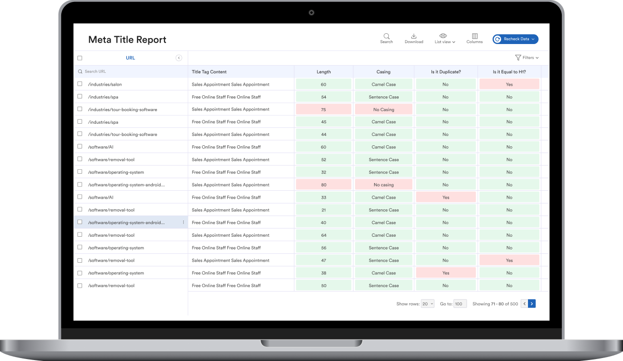 Spot what’s limiting search visibility in minutes. Get structured reports for metadata, indexation, canonicals, headings, status codes, and sitemaps - ready to share.